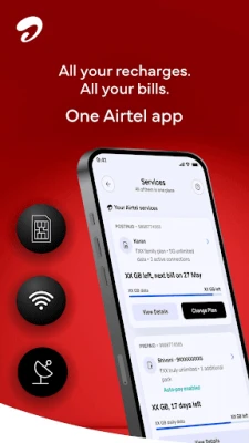 மொபைல் ரீசார்ஜ் முதல் வீட்டு பில் பேமெண்ட் வரை அனைத்தையும் எளிதாக்குகிறது ஏர்டெல். உங்கள் ப்ரீபெய்ட் எண்ணுக்கு டாக் டைம், 5G டேட்டா மற்றும் பலவற்றை நிமிடங்களில் ரீசார்ஜ் செய்யுங்கள். உங்கள் குடும்ப உறுப்பினர்களின் மொபைல் இணைப்புகளையும் ஒரே இடத்தில் நிர்வகிக்கலாம், ரீசார்ஜ் நினைவூட்டல்களையும் பெறலாம். போஸ்ட்பெய்ட் பில்களை ஒருபோதும் தவறவிடாதீர்கள் – புதிய ஏர்டெல் போஸ்ட்பெய்ட் இணைப்பைப் பெறலாம், தானியங்கி கட்டணச் சேவையை செயல்படுத்தலாம் மற்றும் பல இணைப்புகளை சிரமமின்றி நிர்வகிக்கலாம். DTH ரீசார்ஜ், பிராட்பேண்ட் பில் பேமெண்ட் என உங்கள் பொழுதுபோக்கு மற்றும் இணையத் தேவைகளுக்கான கட்டணங்களையும் எளிதாகச் செலுத்துங்கள். மின்சாரம், தண்ணீர், சமையல் எரிவாயு சிலிண்டர் முன்பதிவு, பைப் எரிவாயு, பள்ளி கட்டணம் மற்றும் பிற பயன்பாட்டு பில்களை உடனடியாக செலுத்தி உங்கள் நேரத்தை மிச்சப்படுத்துங்கள்.