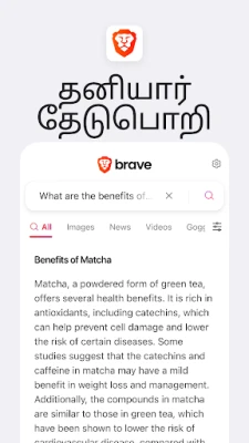 Brave உலாவியில் இணைய உலகின் புதுமையான பயணத்தை அனுபவிக்க தயாராகுங்கள். விரைவான, பாதுகாப்பான மற்றும் தனிப்பட்ட இணைய உலாவலை வழங்கும் நோக்கத்துடன் வடிவமைக்கப்பட்ட Brave, உங்கள் டிஜிட்டல் அனுபவத்தை முழுமையாக மாற்றுகிறது. புத்தம் புதிய Brave Leo AI உதவியாளர் உலாவிக்குள்ளேயே இலவசமாகக் கிடைக்கிறார். கேள்விகளைக் கேட்டு, உடனடி பதில்களைப் பெற்று, மொழிகளை மொழிபெயர்த்து, மேலும் பலவற்றைச் செய்து உங்கள் உலாவல் அனுபவத்தை ஒரு புதிய நிலைக்கு உயர்த்துங்கள். தனியுரிமைக்கு முதலிடம் தரும் Brave Search மூலம் இணையத்தில் சுயாதீனமான தேடலை மேற்கொள்ளுங்கள், இது நீங்கள் இதுவரை கண்டிராத முற்றிலும் பாதுகாப்பான மற்றும் முழுமையான தேடல் அனுபவத்தை வழங்குகிறது.