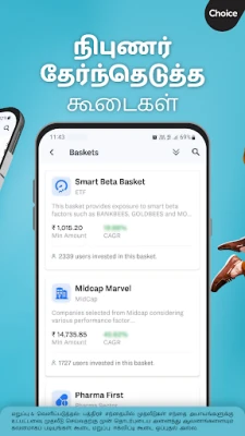புத்திசாலித்தனமான முதலீட்டாளர்களுக்கும், Choice FinX பல்துறை அம்சங்களை வழங்குகிறது. பங்குகள், பரஸ்பர நிதிகள், ETF-கள், பத்திரங்கள், அரசுப் பத்திரங்கள் மற்றும் பொருட்கள் போன்ற பல்வேறு சொத்து வகுப்புகளில் முதலீடு செய்வதன் மூலம் உங்கள் போர்ட்ஃபோலியோவை சமநிலைப்படுத்தலாம். நிபுணர்களால் தொகுக்கப்பட்ட கருப்பொருள் மற்றும் துறை சார்ந்த கூடைகளில் முதலீடு செய்து வசதியாக பல்வகைப்படுத்தலாம். ஆழ்ந்த ஆராய்ச்சி அறிக்கைகள், IPO பகுப்பாய்வு, நிபுணர் கருத்துகள் மற்றும் தனிப்பயனாக்கப்பட்ட பரிந்துரைகளுடன் சந்தைப் போக்குகளுடன் புதுப்பித்த நிலையில் இருங்கள். Choice Equity Broking Private Limited நிறுவனத்தின் 30 ஆண்டுகளுக்கும் மேலான அனுபவம் மற்றும் விருது பெற்ற ஆய்வாளர் சுமீத் பகாடியாவின் தலைமையின் கீழ், Choice FinX உங்களின் ஒவ்வொரு முதலீட்டு முடிவிலும் நம்பகத்தன்மையை உறுதி செய்கிறது.