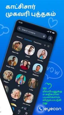 eyecon இன் தனித்துவமான தொழில்நுட்பம், எரிச்சலூட்டும் சந்தைப்படுத்தல் அழைப்புகள் மற்றும் ஸ்பேம் எண்களைத் துல்லியமாக அடையாளம் கண்டு தடுக்கிறது. தேவையற்ற குறுக்கீடுகள் இல்லாமல் உங்கள் தொலைபேசி உரையாடல்களை அனுபவிக்க இது உதவுகிறது. மேலும், eyecon உங்கள் சாதாரண தொலைபேசி முகவரிப் புத்தகத்தை ஒரு அற்புதமான, புகைப்படங்கள் நிறைந்த காட்சியாக உருமாற்றுகிறது. உங்கள் நண்பர்கள் மற்றும் குடும்பத்தினரை அவர்களின் படங்களுடன் பார்த்து, அவர்களுடன் எளிதில் இணைய உதவுகிறது. ஒரு அழைப்பாளர் யார் என்பதைப் பற்றிய முழுமையான புரிதலுக்கு, அவர்களின் சமூக ஊடக சுயவிவரங்கள் மற்றும் பிற டிஜிட்டல் தகவல்களையும் அணுகும் வசதியை eyecon உங்களுக்கு வழங்குகிறது.