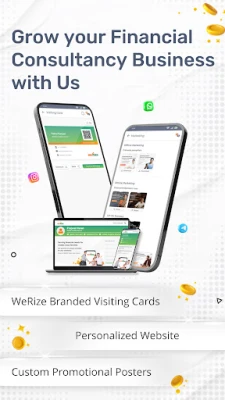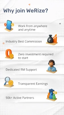 WeRize பார்ட்னர் செயலி மூலம், உங்கள் வாடிக்கையாளர்களுக்கு பலதரப்பட்ட கடன் மற்றும் சேமிப்புத் தயாரிப்புகளை எளிதாக வழங்க முடியும். கடன் பிரிவில், தனிப்பட்ட தேவைகளுக்கான சம்பளதாரர்களுக்கான பாதுகாப்பற்ற கடன்கள், சிறு மற்றும் நடுத்தர நிறுவனங்களின் வளர்ச்சியை ஊக்குவிக்கும் வணிகக் கடன்கள், மற்றும் சொத்து மதிப்பை பயன்படுத்திக் கொள்ளும் சொத்து அடமானக் கடன்கள் போன்றவற்றை வழங்கலாம். சேமிப்பு மற்றும் முதலீட்டுப் பிரிவில், 24K தங்கத்தில் பாதுகாப்பான முதலீடான ஆன்லைன் தங்கம் மற்றும் சந்தையில் அதிக வட்டி விகிதங்களை வழங்கும் நிலையான வைப்பு நிதிகள் (FDs) போன்ற திட்டங்கள் அடங்கும். WeRize உடன் இணைவதன் முக்கிய பலன்கள்: மாதந்தோறும் ₹1 லட்சத்திற்கும் மேல் சம்பாதிக்கும் வாய்ப்பு, முற்றிலும் டிஜிட்டல் மயமாக்கப்பட்ட செயல்முறைகள் (காகிதமற்ற வேலைகள்), விரைவான வாராந்திர பணம் பட்டுவாடா, உங்கள் சொந்த பிராண்டை உருவாக்க இலவச தனிப்பயனாக்கப்பட்ட இணையதளம், விசிட்டிங் கார்டுகள் மற்றும் விளம்பர ஆதரவு, அத்துடன் முழுமையான பயிற்சி மற்றும் அர்ப்பணிப்புடன் கூடிய ஆதரவு ஆகியவை கிடைக்கும். கடன் முகவர்கள் (DSAs), நிதி ஆலோசகர்கள், காப்பீட்டு நிபுணர்கள், செல்வ மேலாளர்கள், ஓய்வு பெற்ற வங்கி ஊழியர்கள் மற்றும் முதலீட்டு ஆலோசகர்கள் போன்ற நிதித் துறையைச் சார்ந்த அனைவருக்கும் இது ஒரு பொன்னான வாய்ப்பு.